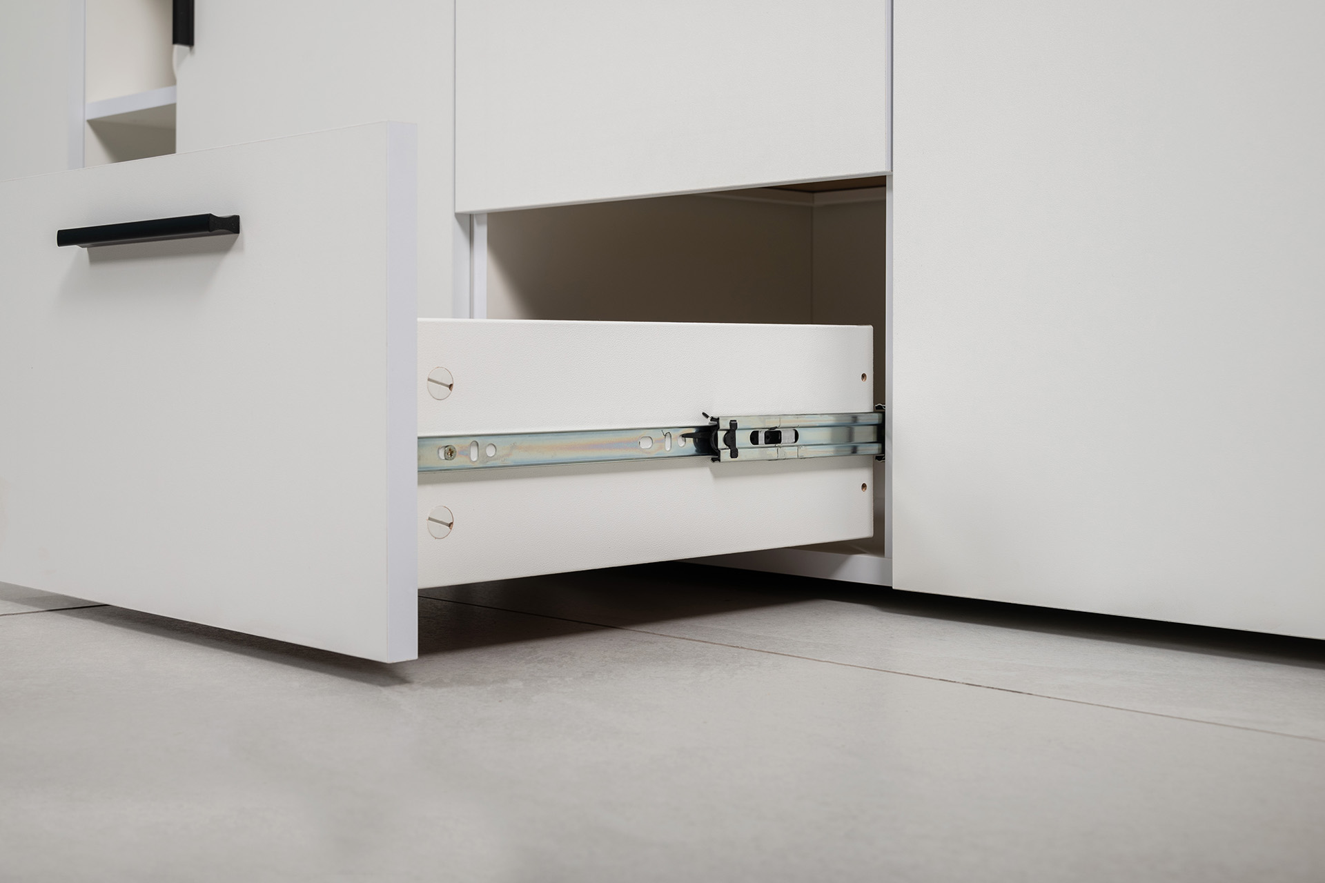 Модули универсальны и сочетаются между собой. Открытые и закрытые ниши для хранения, защитные пластиковые демпферы, съемные полки, направляющие полного выдвижения в ящиках – комфорт продуман до мелочей.
