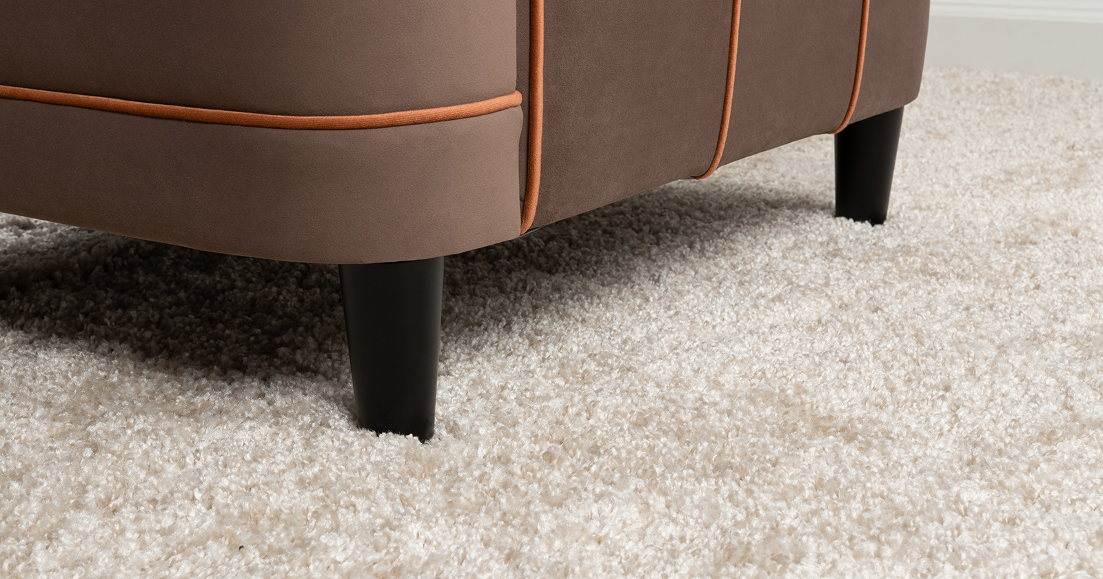 Декоративные канты на вставке подлокотников. Пуговицы в местах пересечения кантов на подушке и вставке подлокотников. По торцам подлокотников и думках контрастный декоративный кант. Защипы на сиденье и подушке.