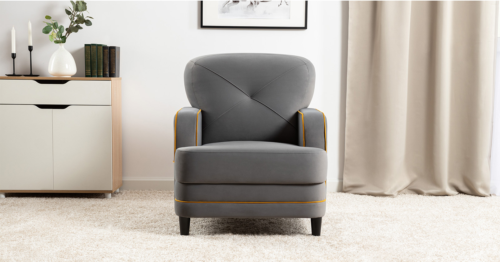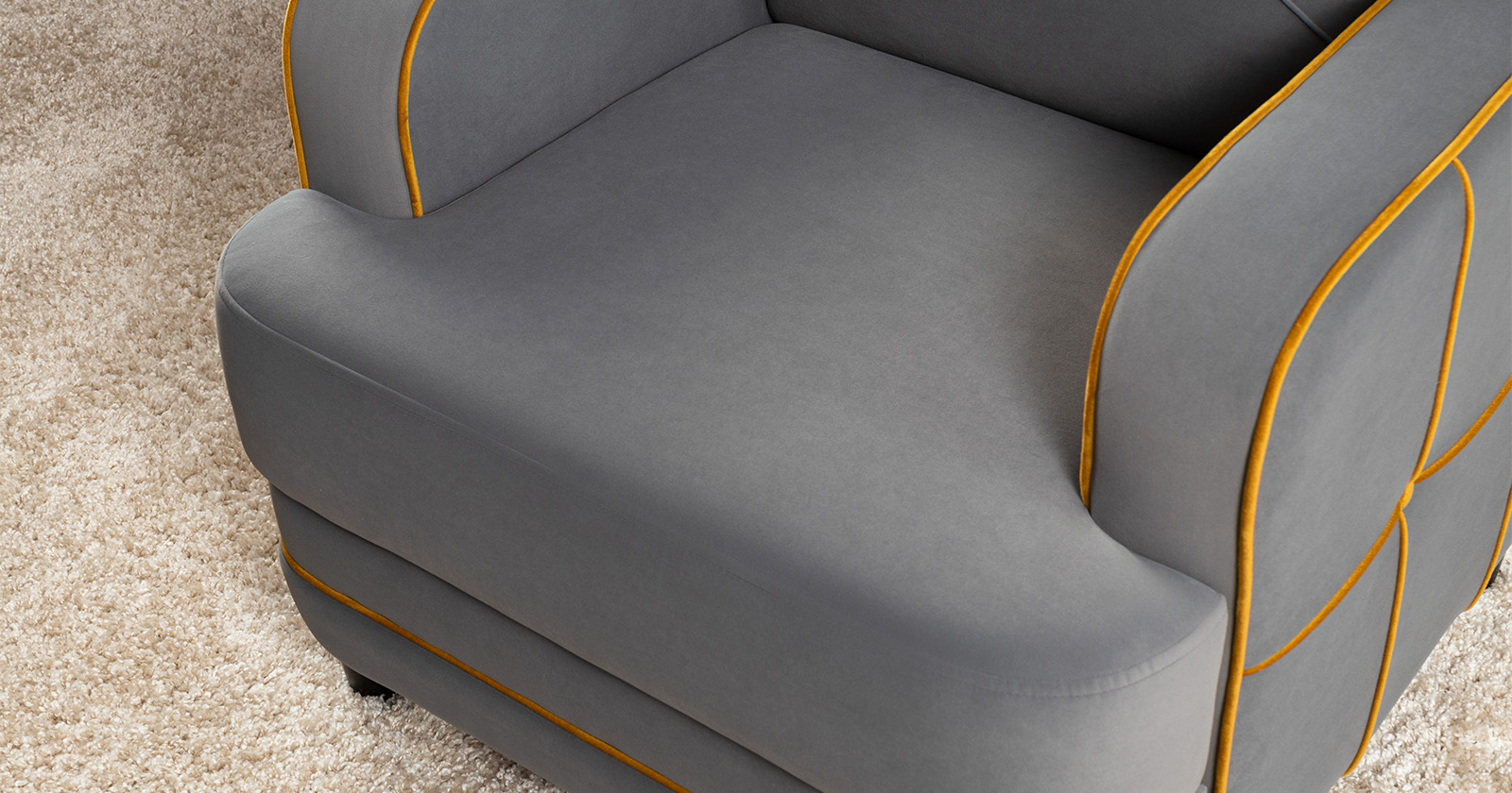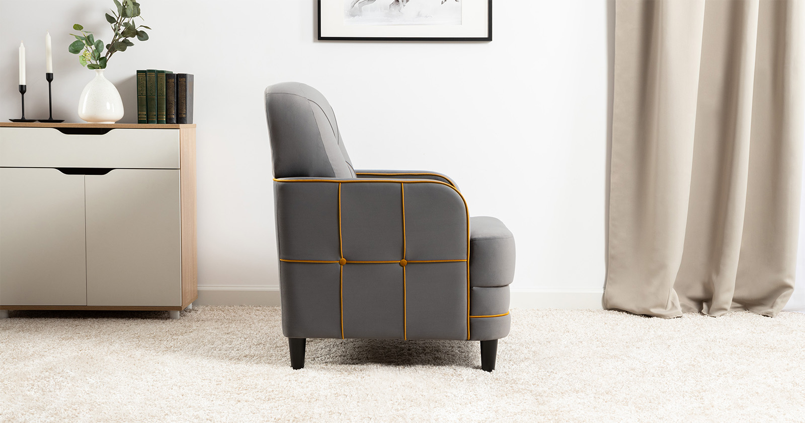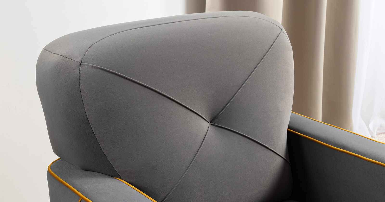 Декоративные канты на вставке подлокотников. Пуговицы в местах пересечения кантов на подушке и вставке подлокотников. По торцам подлокотников и думках контрастный декоративный кант. Защипы на сиденье и подушке.
