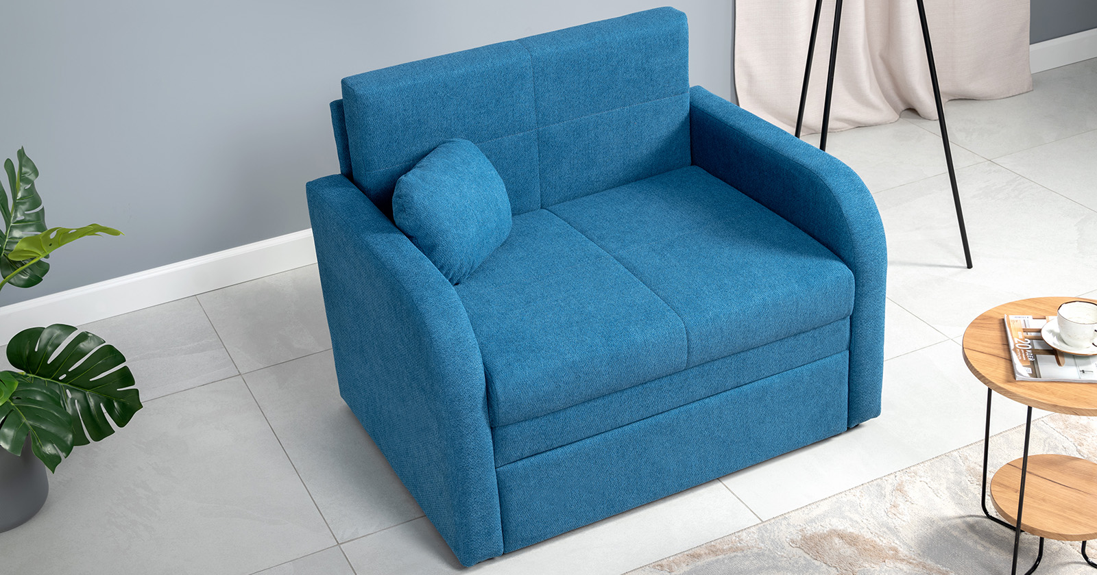 Коллекция выполнена в современном минималистичном стиле с мягкой обивкой из износостойкой ткани и декоративной стежкой, подчеркивающей геометрию форм. Механизм трансформации обеспечивает дополнительное спальное место, делая мебель не только эстетичной, но и максимально функциональной для небольших пространств.
