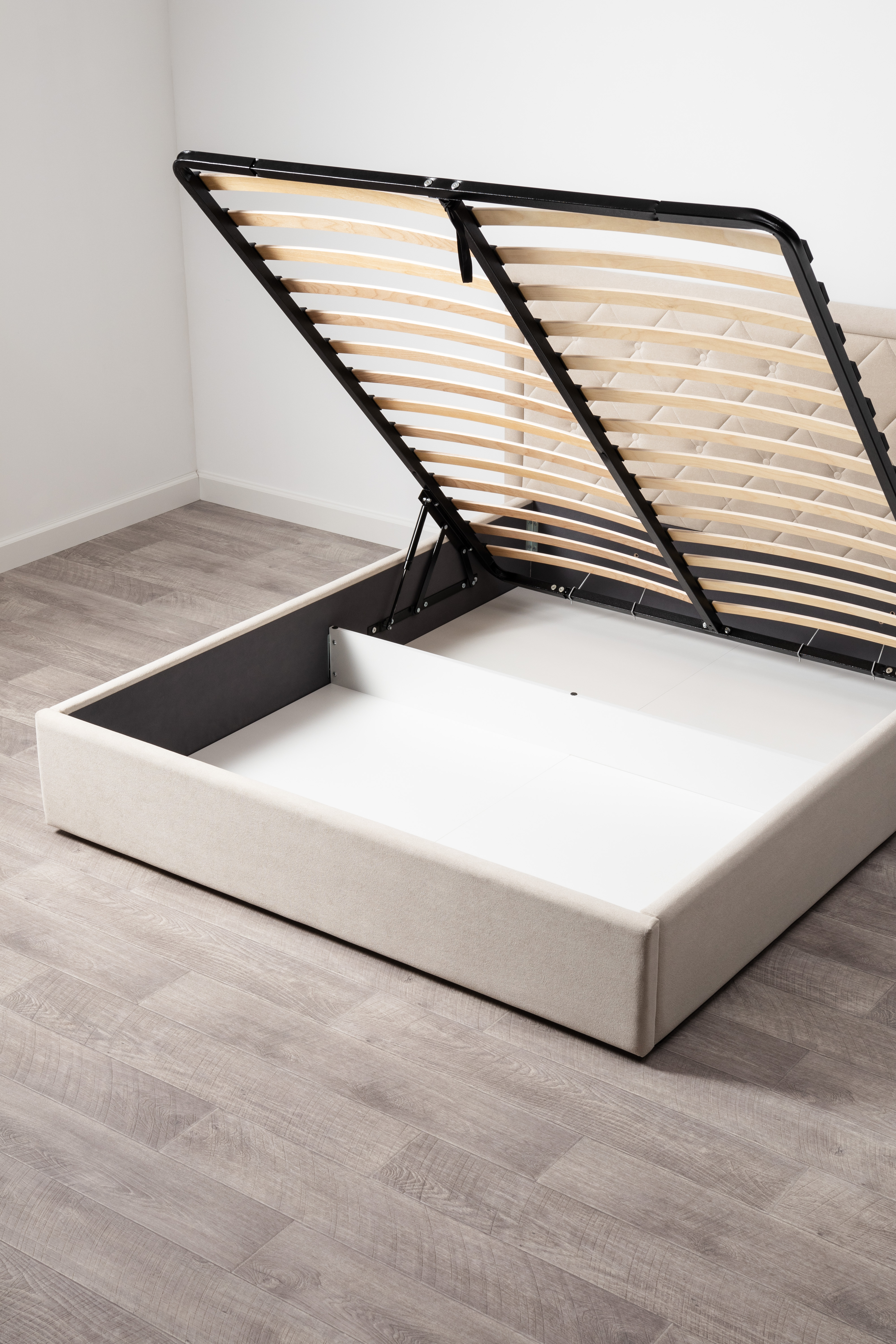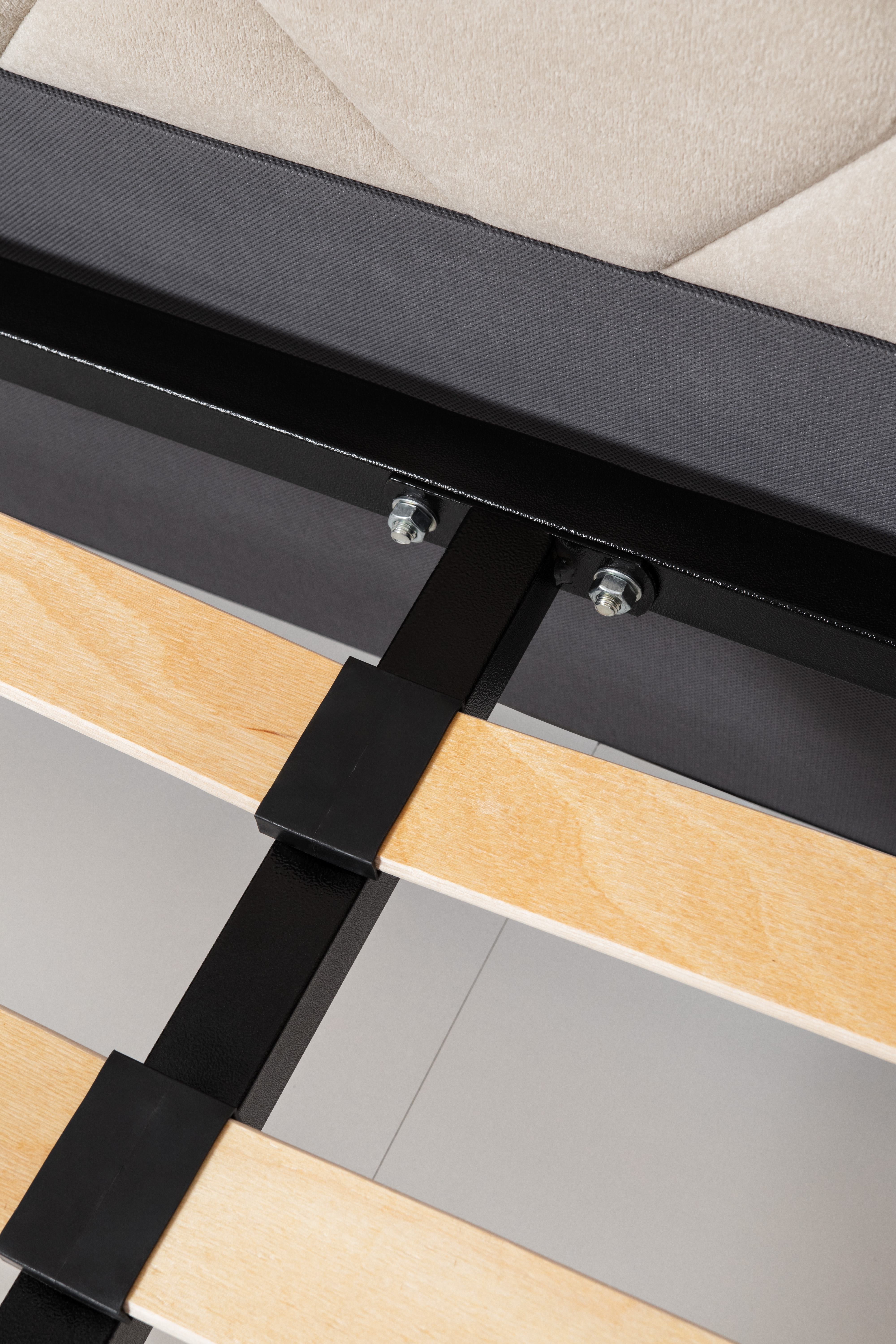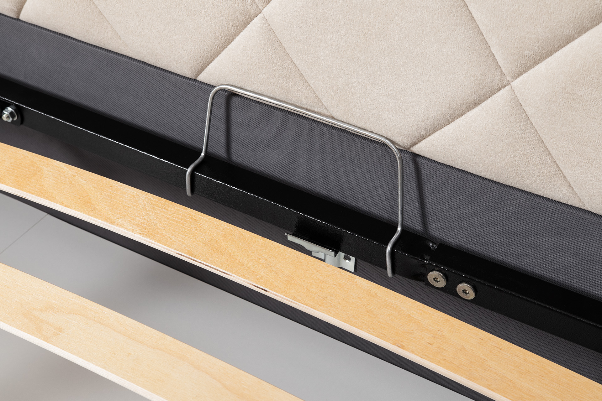 Основание кровати укомплектовано матрасодержателями. Жесткое кроватное дно из ЛДСП 16 мм на опорах 25 мм.