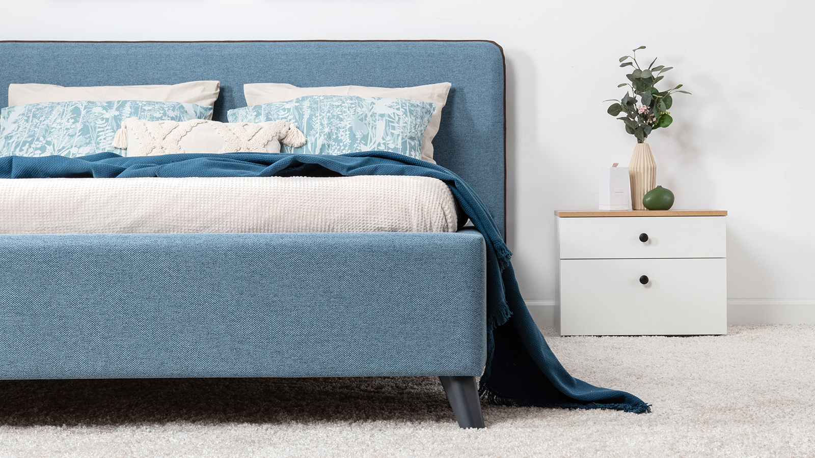 Cкругленный торец изголовья оформлен контрастным кантом.