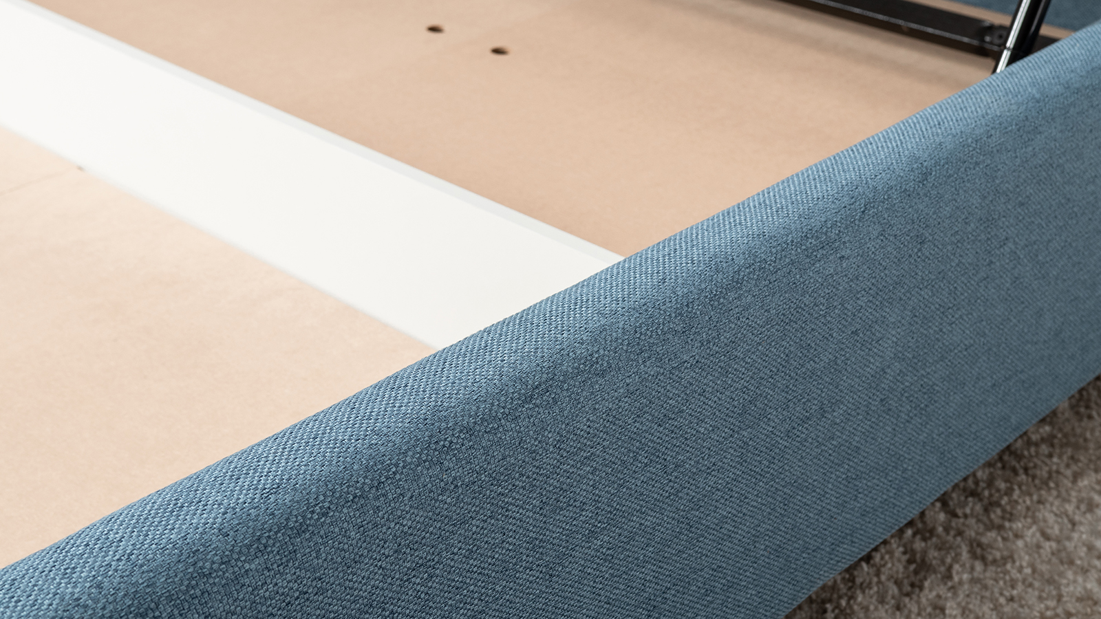 Основание кровати укомплектовано матрасодержателями. Жесткое кроватное дно из МДФ 6 мм. Задняя стенка изголовья выполнена в тех. ткани (спанбонд).