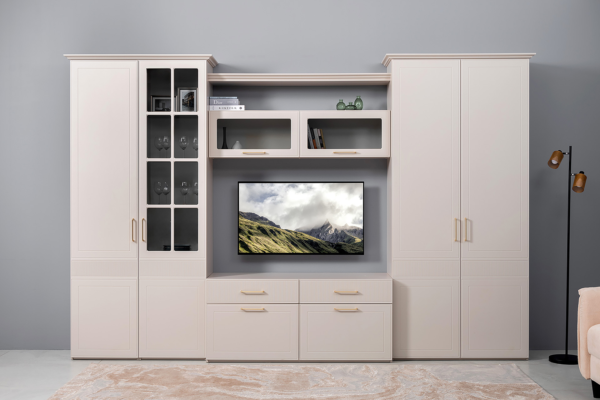 Фрезерованные фасады из МДФ, металлические ручки и витрины с тонированным стеклом создают изысканный образ.