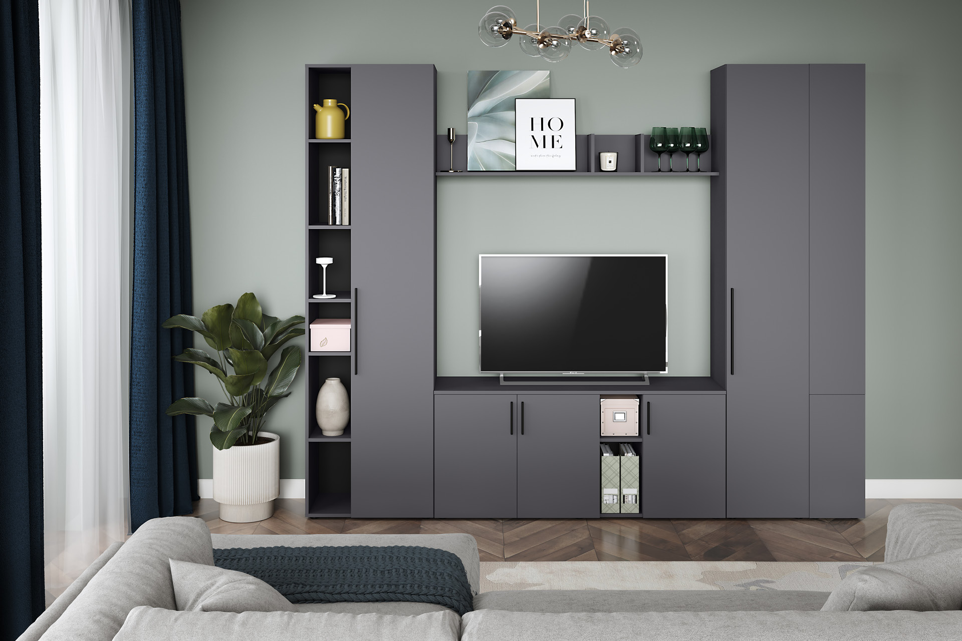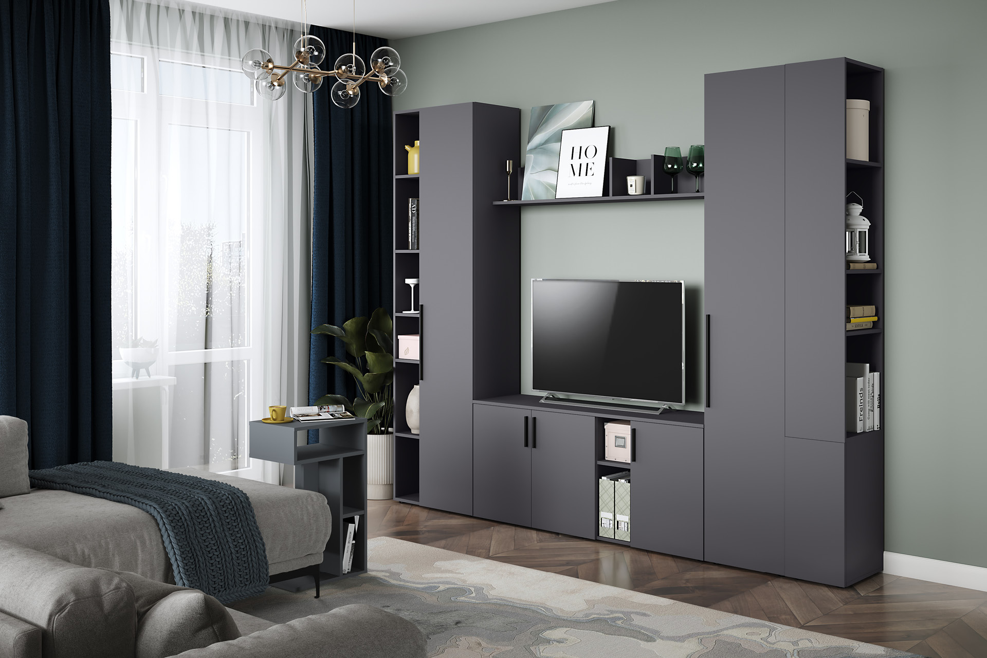 Шкаф-пенал в гостиную Остин 13.227 серый графит 0162 РЕ, дуб золотой CRAFT, графит ZB 856-2 ПВХ