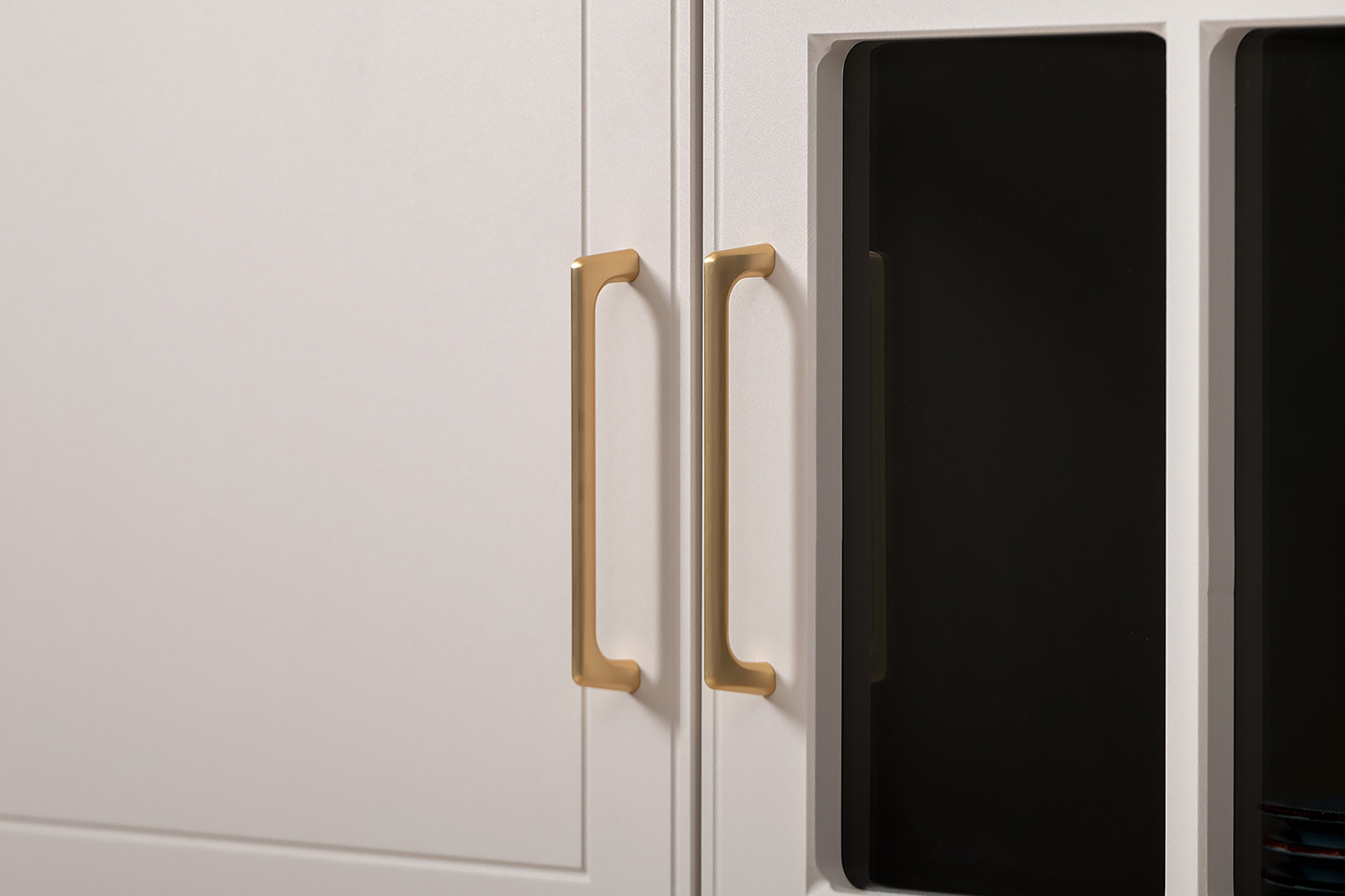 Фрезерованные фасады из МДФ, металлические ручки и витрины с тонированным стеклом создают изысканный образ.