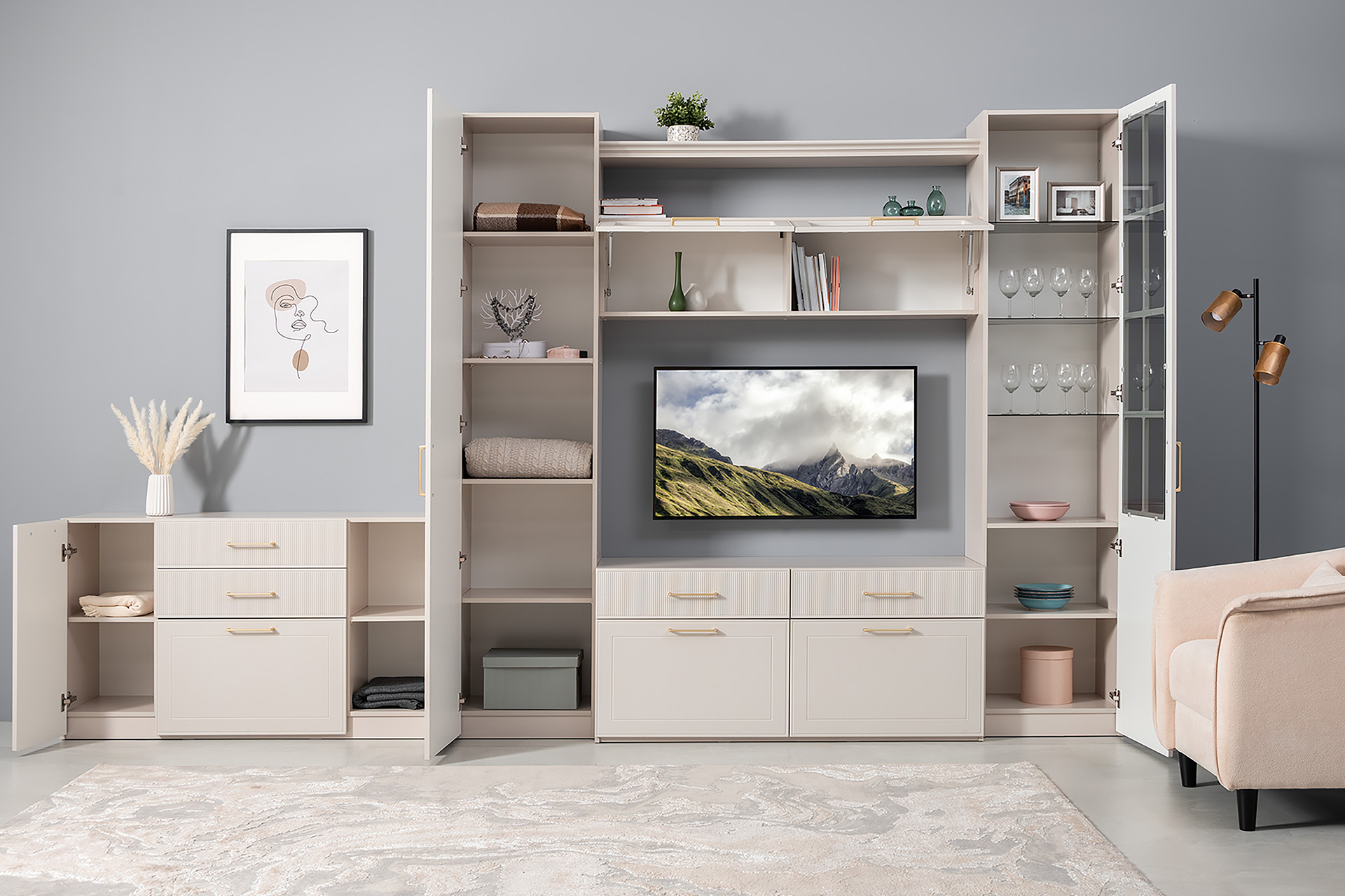 Шкаф-пенал в гостиную Ливерпуль белый, ясень ваниль ПВХ