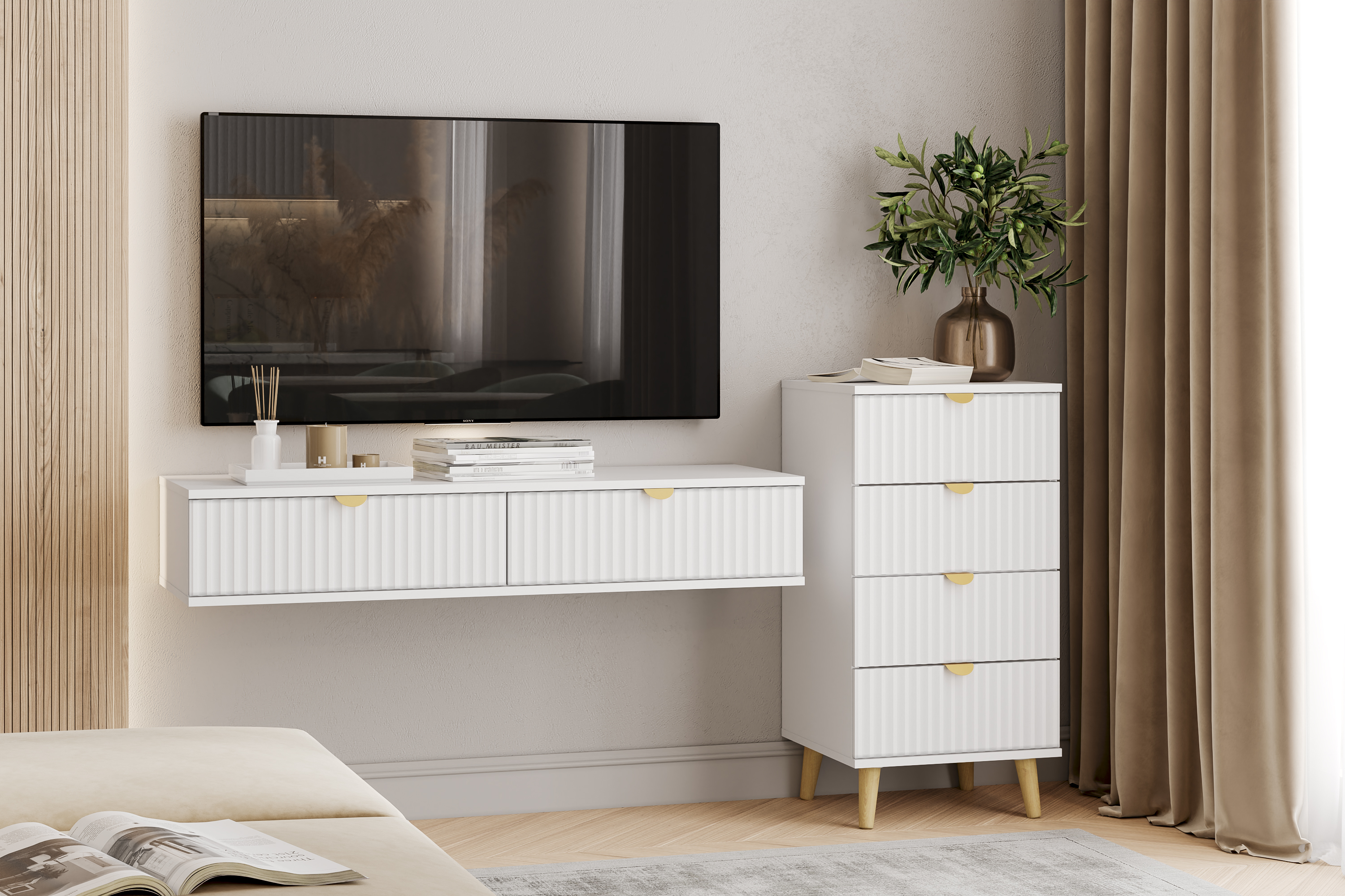 Тумба под ТВ в гостиную Петра 13.281 белый PE шагрень, милк софт ПВХ, бетон чикаго беж ПВХ