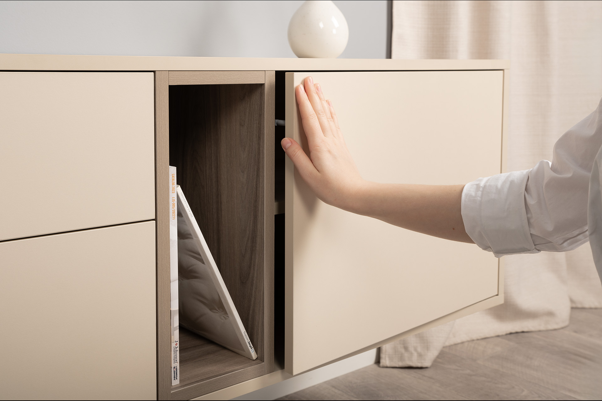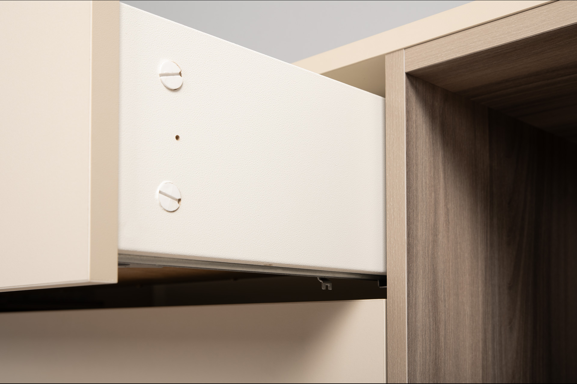 Фасады с механизмом push-to-open, направляющие скрытого монтажа, петли с доводчиками, утолщённая кромка – комфорт продуман до мелочей.